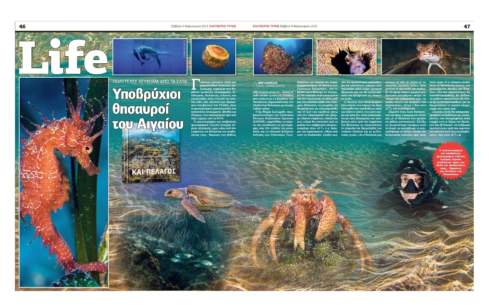 Γιγάντιες φάλαινες αλλά και μικροσκοπικό πλαγκτόν, πολύχρωμα κοράλλια που θυμίζουν τροπικούς προορισμούς, ιππόκαμποι, θαλάσσιες χελώνες και εκατοντάδες άλλα γνωστά και σπάνια είδη, όλοι κάτοικοι των θαλασσών που βρέχουν την Ελλάδα είναι οι φωτογραφικοί πρωταγωνιστές του πολυτελούς λευκώματος «Βένθος και Πέλαγος» που κυκλοφόρησε πριν από λίγες ημέρες από τα ΕΛ.ΤΑ. Ο ωκεανογράφος και υποβρύχιος φωτογράφος Γιάννης Ίσσαρης πέρασε ατελείωτες ώρες κάτω από την επιφάνεια της θάλασσας και απαθανάτισε τους… θαμώνες των βυθών, από τα ρηχά μέχρι τα… άπατα σε κάθε σχεδόν γωνιά της Ελλάδας που απλώνεται το βασίλειο του Ποσειδώνα, παρουσιάζοντας τον πλούτο των θαλασσών με έναν μοναδικό τρόπο. Η Δρ. Μαρία Σαλωμίδη, Περιβαλλοντολόγος του Ελληνικού Κέντρου Θαλασσίων Ερευνών (ΕΛΚΕΘΕ) επιμελήθηκε των κειμένων που συνοδεύουν τις φωτογραφίες στις 264 σελίδες της μοναδικής για τα ελληνικά δεδομένα έκδοσης των Ελληνικών Ταχυδρομείων, στο πλαίσιο της σειράς γραμματοσήμων «Ο πλούτος των Ελληνικών Θαλασσών». «Με το βιβλίο αυτό θέλουμε να δώσουμε την ευκαιρία στον αναγνώστη που δεν καταδύεται να κάνει μαζί μας ένα εικονικό ταξίδι στις ελληνικές θάλασσες, να γνωρίσει, να θαυμάσει και να πληροφορηθεί για τη ζωή που κρύβεται κάτω από την αδιαπέραστη στο βλέμμα υδάτινη επιφάνεια, ελπίζοντας πως τελικά θα γοητευτεί από τη μαγεία του υποβρύχιου κόσμου», αναφέρει στον «Ε.Τ.» ο κ. Ίσσαρης και συμπληρώνει: «Μέσα από αυτή τη διαδικασία, ελπίζω πως όλο και περισσότεροι συμπολίτες μας θα αποκτήσουν σεβασμό στην πολύπαθη αλλά ακόμη ζωντανή θάλασσα μας και θα αναγνωρίσουν τον πραγματικό της πλούτο: τη ζωή!». Ο πλούτος των πληροφοριών που υπάρχει στα κείμενα της Δρος Σαλωμίδη έχει αποδοθεί με απλό και εύληπτο τρόπο, έτσι ώστε ακόμα και όσοι δεν είναι εξοικειωμένοι με τους θησαυρούς που κρύβονται κάτω από την επιφάνεια της θάλασσας να κατανοήσουν τη σημασία της διαφύλαξης του ενάλιου πλούτου για τις μελλοντικές γενιές: «Αν η θάλασσά μας υστερεί σε κάτι σε σχέση με τις μακρινές, εξωτικές άλλες, είναι μονάχα σε φροντίδα και ανάδειξη. Κι όμως, αυτή η γνωστή μας άγνωστη καταφέρνει ακόμα, σε πείσμα της αδιαφορίας μας, να κρύβει πλούτη και ομορφιές που σαγηνεύουν», εξηγεί η ίδια στον «Ε.Τ.» και συμπληρώνει: «Είμαστε ένας λαός θαλασσινός και όμως η μακραίωνη σχέση μας με τη θάλασσα έχει αρχίσει να φθίνει ανησυχητικά. Ελπίζω να ξαναχτίσουμε εγκαίρως αυτό το δεσμό, να προλάβουμε να ανακαλύψουμε το πλήρες φάσμα της θαλασσινής ευλογίας πριν είναι πολύ αργά». Ο κ. Ίσσαρης ελπίζει ότι με τη διάχυση της γνώσης που προσφέρει το «Βένθος και Πέλαγος», όλο και περισσότεροι θα ευαισθητοποιηθούν, θα ψάξουν να μάθουν περισσότερα και τελικά θα δραστηριοποιηθούν για να διαφυλάξουν τη φυσική κληρονομιά της χώρας μας: «Εύκολα κανείς θα αποκρυπτογραφήσει τη βαθύτερη μας σκοπιμότητα, που σκιαγραφείται πολύ κομψά από τα λόγια του θρυλικού Ζακ-Υβ Κουστώ: «Οι άνθρωποι προστατεύουν αυτό που αγαπούν και αγαπούν αυτό που καταλαβαίνουν», λέει στον «Ε.Τ.».
